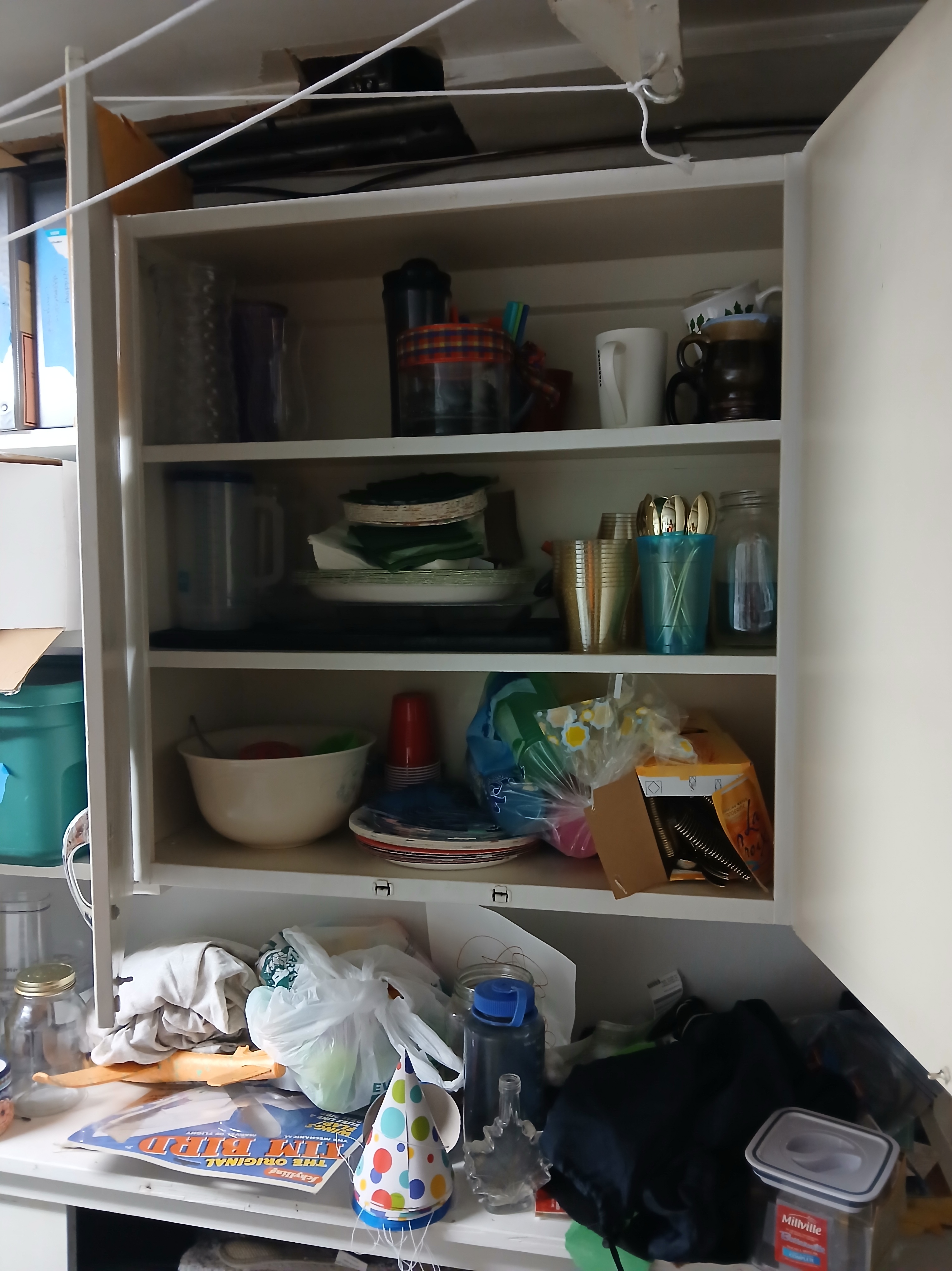 A lot of progress came from making better use of her existing storage pieces. By combining items and using baskets she already owned, we grouped categories like party supplies (plasticware, paper plates, etc.) and condensed duplicates. This created more room inside the cabinets and made everything easier to find.